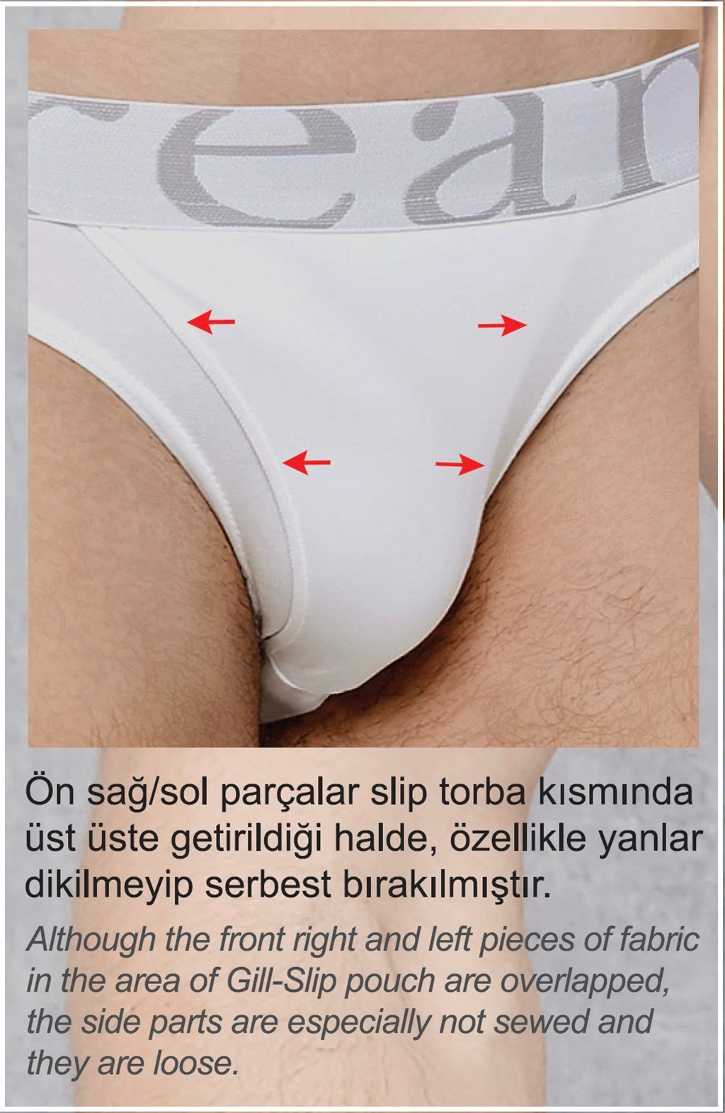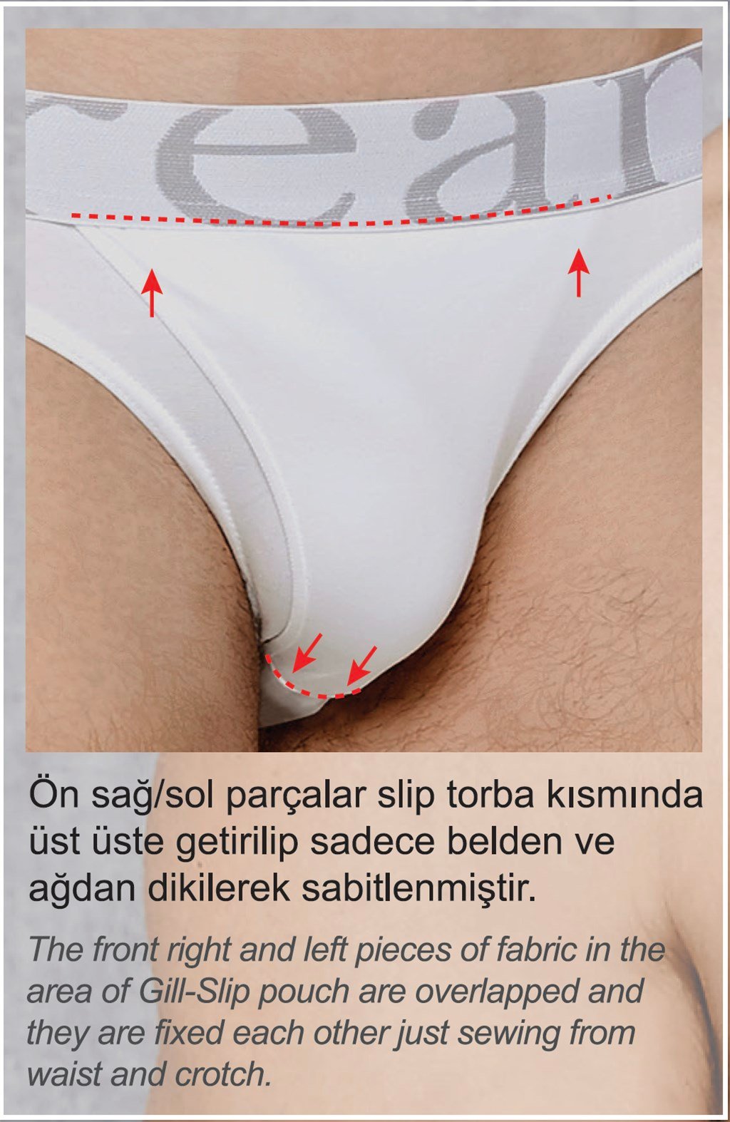 Özel tasarım Doreanse Slip ön sağ/sol parçalar slip torba kısmında üst üste getirilip sadece belden ve ağdan dikilerek sabitlenmiştir. Yan bölgeler dikilmediği için serbest bırakılmıştır. Torba tasarımındaki gerekli büyüklüğü kendiliğinden oluşturmaktadır.